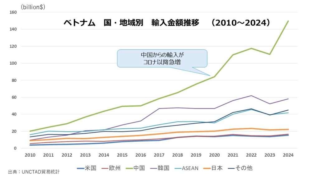 ところがその後コロナ禍を経て、ベトナムの製造業も発達する一方で、中国リスク回避を含めて、日本以外からの投資が急増。中国からの輸入や投資を踏まえて米国向け輸出拠点化が加速していきました。この15年の変化は実に大きなものがあります。あまり多くの人が注目していませんが、実態として日本企業のベトナムにおけるプレゼンスが低下しているのではないかとの意識があり、UNCTAD貿易統計のデータを分析してみました。