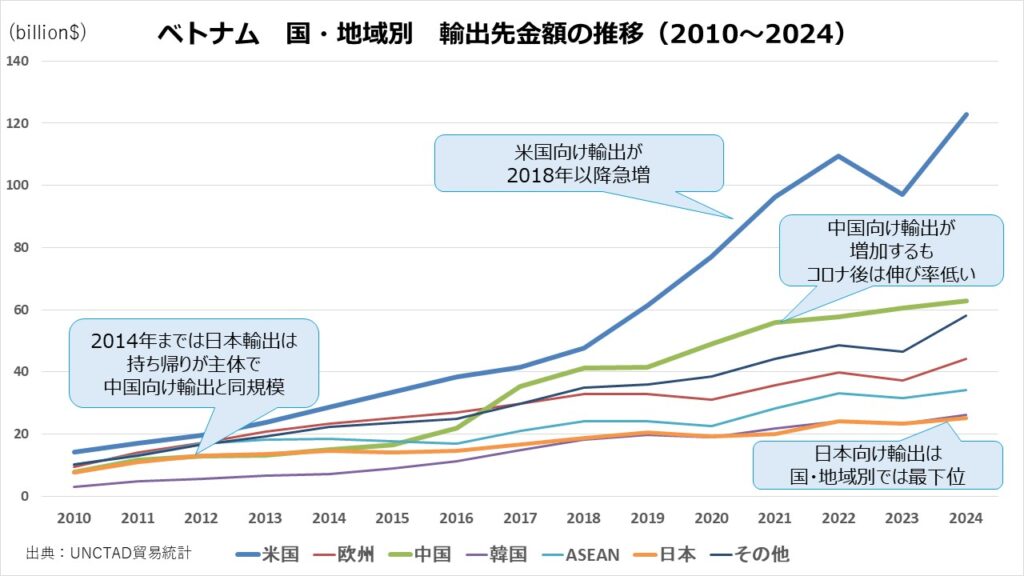 冒頭のグラフを見ていただければわかりますが、2015年あたりからベトナムの輸出金額が急増しています。中でもアメリカ向け輸出が2018年以降突出して増えています。一方、中国向け輸出も増えていますが、コロナ以後の伸び率は低くなっています。