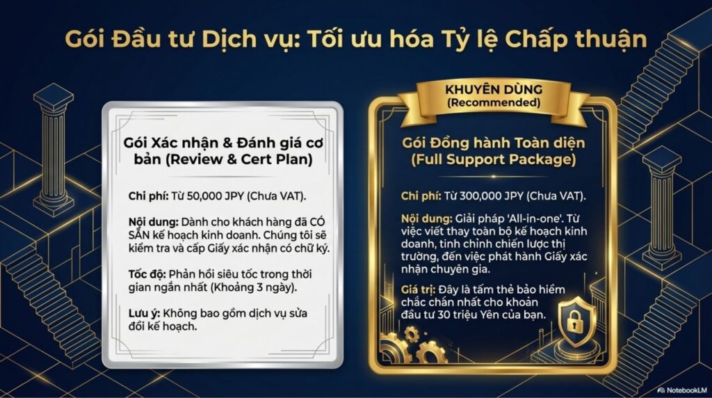 Khi tiếp nhận dịch vụ phát hành văn bản xác nhận đối với kế hoạch kinh doanh, công ty chúng tôi sẽ tiến hành đánh giá nhanh chóng trong thời gian ngắn và cung cấp văn bản xác nhận với chi phí hợp lý, với điều kiện là bản thân doanh nghiệp đã chuẩn bị đầy đủ một kế hoạch kinh doanh hoàn chỉnh để nộp cho Cục Xuất nhập cảnh.