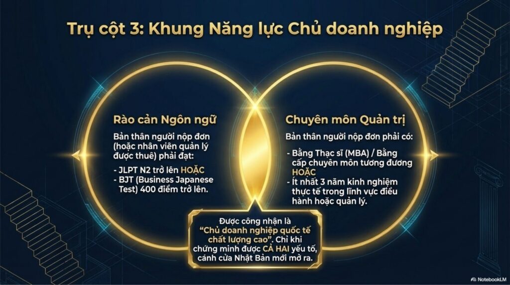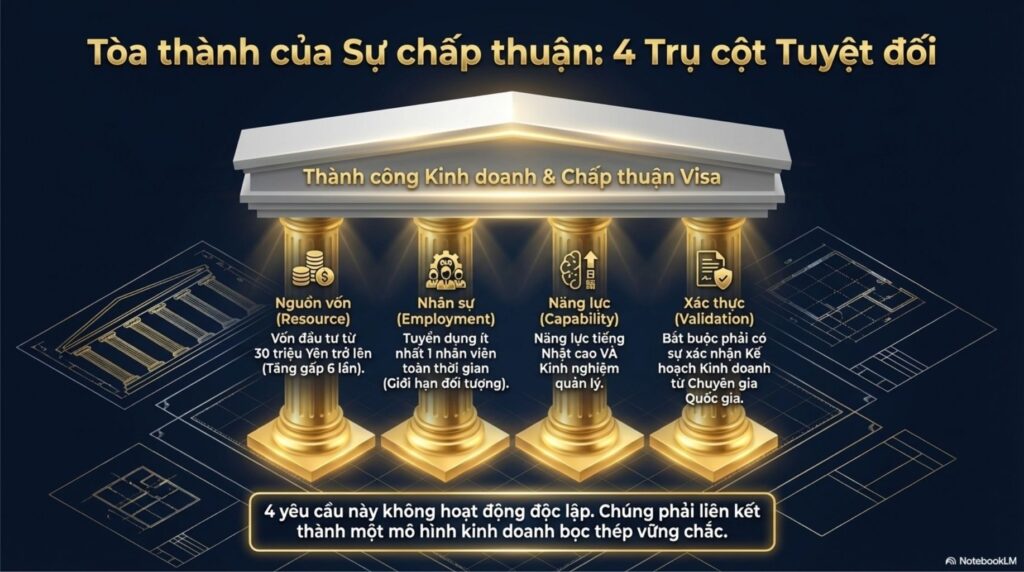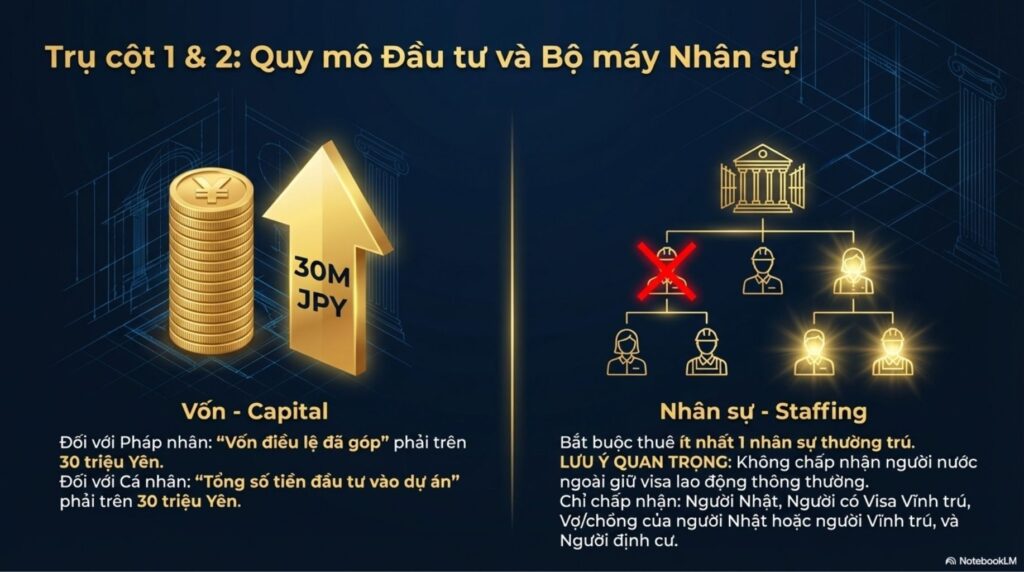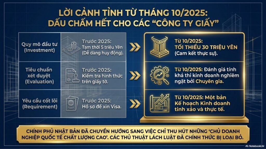 Từ tháng 10 năm ngoái, các điều kiện cấp visa đã được siết chặt đáng kể: vốn điều lệ tối thiểu được nâng lên 30 triệu yên, yêu cầu có ít nhất một nhân viên làm việc toàn thời gian, yêu cầu về năng lực tiếng Nhật, nghĩa vụ có văn phòng hoạt động, cũng như yêu cầu về thời gian lưu trú tại Nhật Bản. Do đó, các pháp nhân không có thực chất hoạt động kinh doanh sẽ không còn được chấp thuận cấp visa “Quản lý – Kinh doanh”. Bên cạnh việc siết chặt các tiêu chí định lượng, việc bắt buộc phải có sự thẩm định thực chất kế hoạch kinh doanh bởi các chuyên gia quản trị cho thấy đây là một thay đổi thể chế hết sức nghiêm ngặt.
