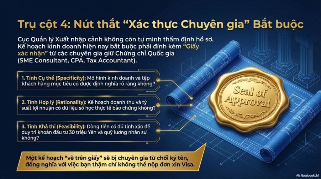 Do việc siết chặt các điều kiện đối với việc xin cấp mới và gia hạn visa “Quản lý – Kinh doanh” lần này, kế hoạch kinh doanh bắt buộc phải được thẩm định bởi các chuyên gia như Chuyên gia tư vấn doanh nghiệp vừa và nhỏ (SME Consultant), hoặc Kế toán công chứng (CPA) hay Chuyên gia thuế. Điều này đồng nghĩa với việc, đối với người nước ngoài muốn thành lập doanh nghiệp tại Nhật Bản, xin visa “Quản lý – Kinh doanh” và hướng tới việc xin thường trú trong tương lai, rào cản đã trở nên rất cao.