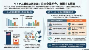 日本企業にとってベトナム展開は、2000年初頭は単なる「日本向けの安価な生産拠点」でした。そして今や米国や欧州市場と直結する「グローバル輸出ハブ」への急速に変貌を遂げました。 しかし、多くの日本企業はこの変化に対応できて […]