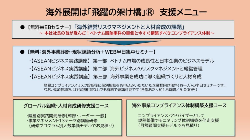 特典  : ・海外リスクマネジメント100項目無料診断コンサルティング